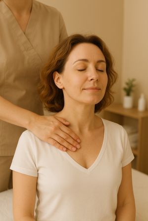 💆♀️ Kinezyterapeutyczny masaż karku, szyi i dekoltu to głęboka, świadoma praca z ciałem, która łączy elementy osteopatii, fizjoterapii, refleksologii i wschodnich technik relaksacyjnych.