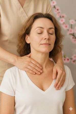 💆♀️ Terapeutyczny masaż karku, szyi i dekoltu to głęboka, świadoma praca z ciałem, która łączy elementy osteopatii, fizjoterapii, refleksologii i wschodnich technik relaksacyjnych.